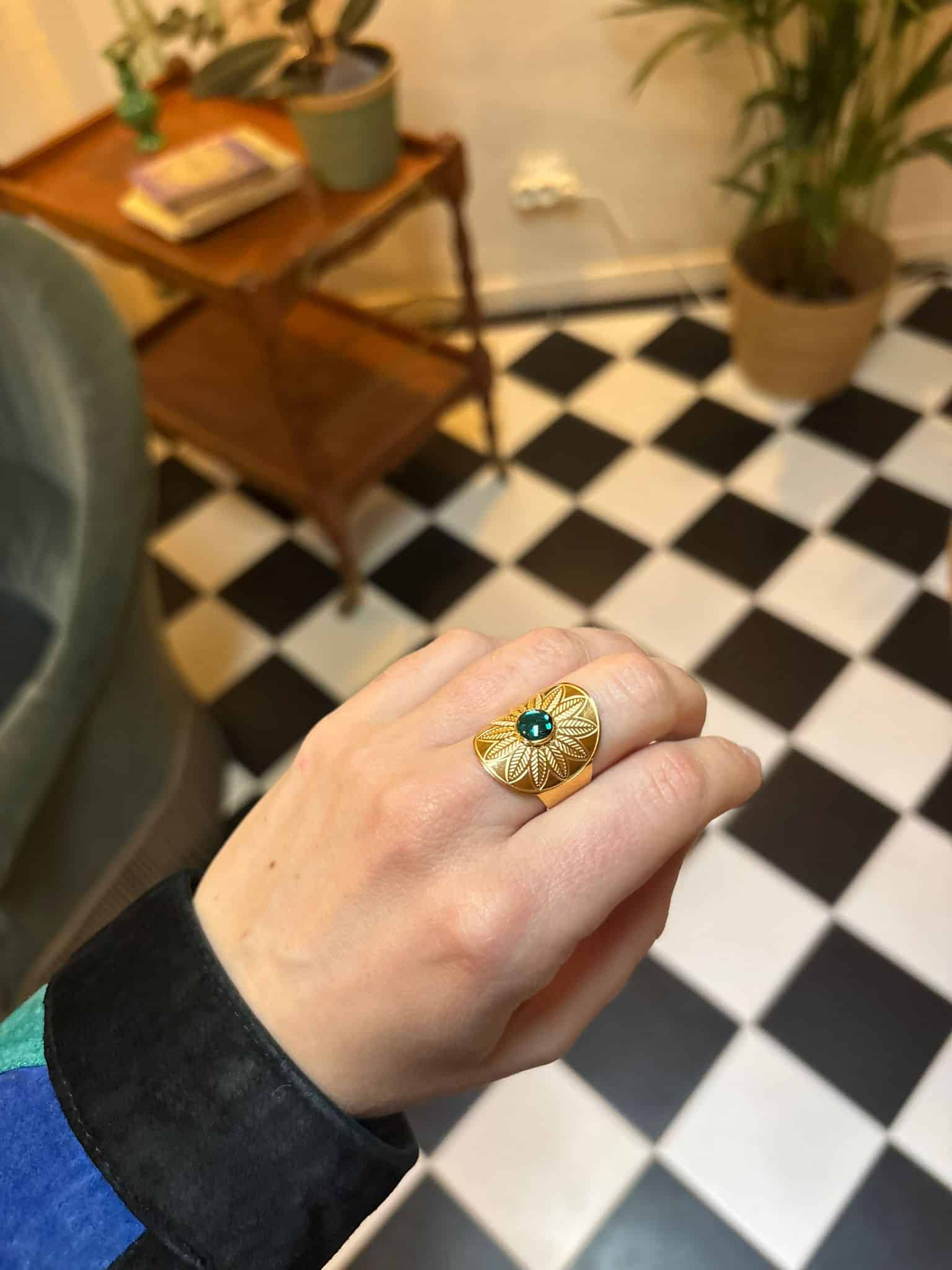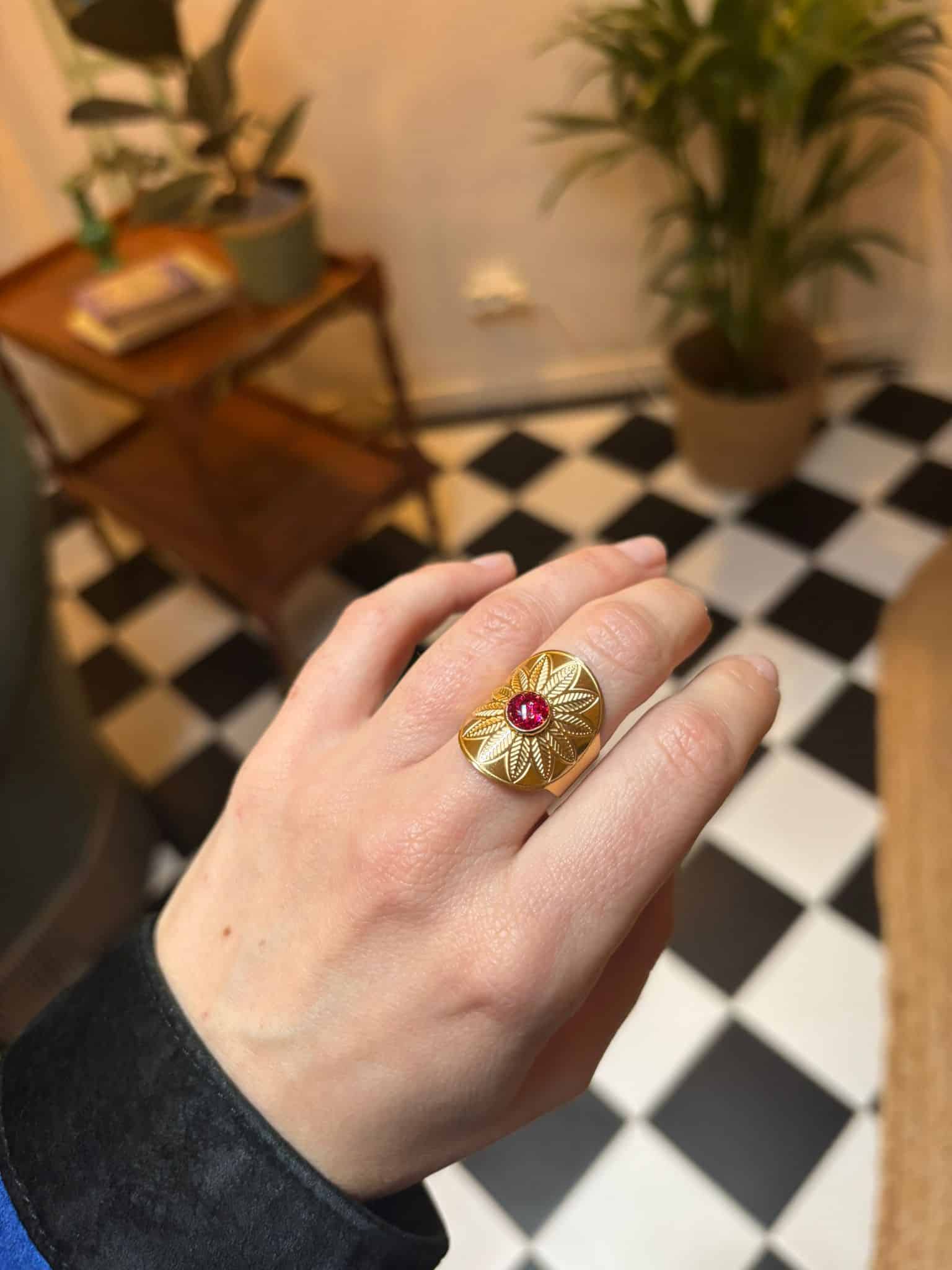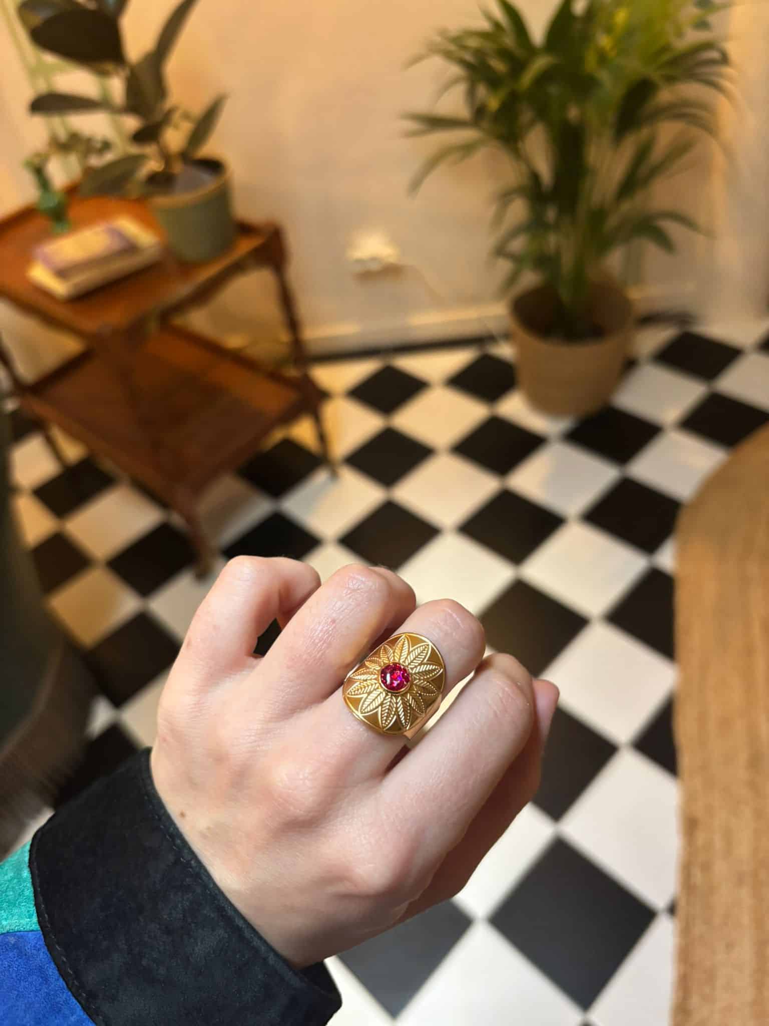 Solaire et majestueuse, la bague Helios attire les regards avec son centre pailleté qui illumine délicatement cette fleur.
