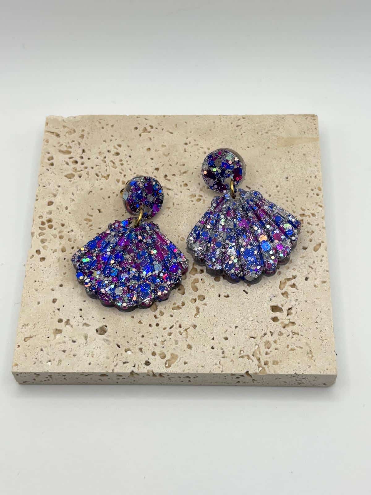Un éclat venu de l’océan… Ces boucles sont une ode à la mer, à ses trésors discrets et scintillants. En forme de coquille Saint-Jacques, ces boucles d’oreilles pendantes captent la lumière à chaque mouvement grâce aux paillettes enchâssées dans la résine époxy.